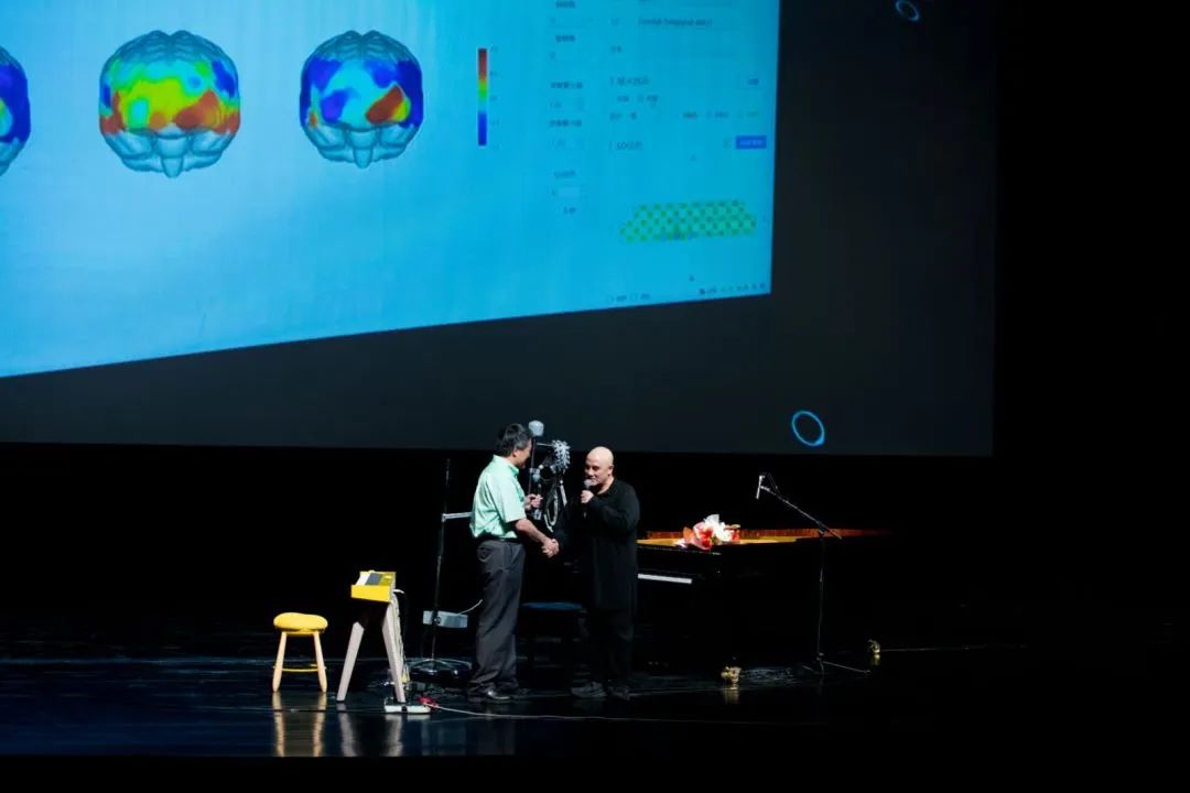 本場(chǎng)音樂會(huì)也得到了清華大學(xué)腦與智能實(shí)驗(yàn)室(簡(jiǎn)稱THBI)的深度參與,將音樂腦科學(xué)實(shí)驗(yàn)搬到了劇場(chǎng),用近紅外光譜腦功能成像設(shè)備同步記錄了孔祥東先生與臺(tái)下六位聽眾的大腦活動(dòng)。音樂會(huì)結(jié)束,THBI首席科學(xué)家王小勤教授上臺(tái)與觀眾分享了音樂腦科學(xué)的相關(guān)知識(shí)以及現(xiàn)場(chǎng)所采集的最新圖像,希望探究藝術(shù)家即興創(chuàng)作這一富有創(chuàng)造力的活動(dòng)以及作為觀眾在審美過程中的大腦機(jī)制。作為被研究對(duì)象,孔祥東先生表示,自己非常有意愿持續(xù)參與音樂腦科學(xué)的相關(guān)研究,希望可以與科學(xué)家們共同攜手一起探索音樂與人類大腦的關(guān)系。
