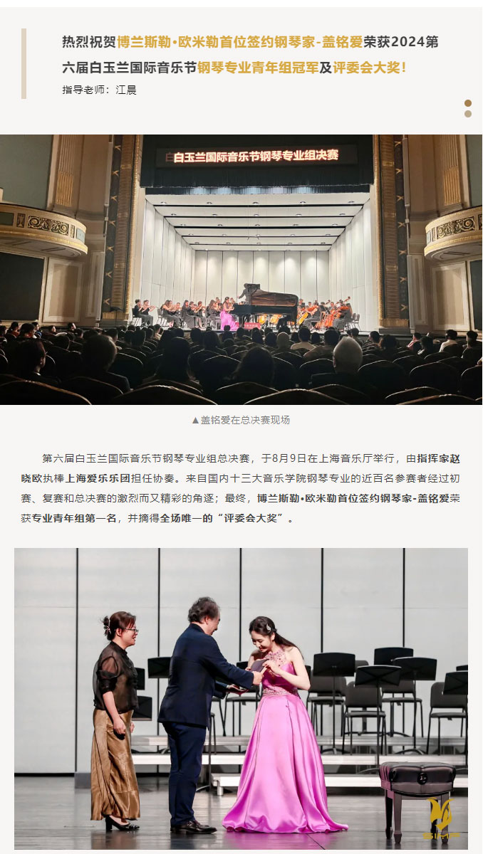 白玉蘭冠軍|祝賀歐米勒首位簽約鋼琴家-蓋銘愛榮獲2024第六屆白玉蘭國(guó)際音樂節(jié)鋼琴專業(yè)組總決賽冠軍!
