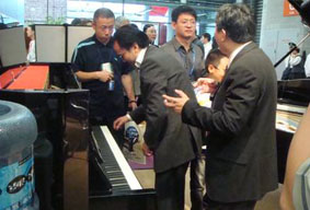 金秋十月,永遠(yuǎn)收獲的季節(jié)!2009年上海國際樂器展又是一 次樂器行業(yè)辛勤勞動所付出后的收獲!本屆樂器展為期四天,于 2009年10月16日在上海新國際博覽中心落下完美的帷幕,本屆 展會上來自德國的國寶博蘭斯勒鋼琴展位雖然亮相上海樂器展已是 多個年頭,但依舊吸引著眾多商家的眼球;更有來自各地音樂學(xué)院 的專家親臨博蘭斯勒展位試奏德國國寶博蘭斯勒鋼琴,聆聽黃金般 的音色,并給予高度的肯定與贊揚!