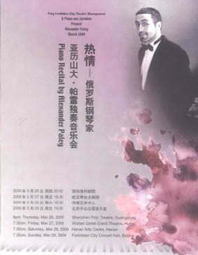國際著名鋼琴大師-博蘭斯勒鋼琴藝術(shù)家-亞歷山大.帕雷,很 多國外的鋼琴愛好者們對(duì)于這個(gè)名字早已如雷貫耳,對(duì)于中國的樂 迷們來說也并不陌生。2006年亞歷山大.帕雷就以博蘭斯勒鋼琴藝 術(shù)家的身份獻(xiàn)技于北京故宮,并以精湛的琴技征服了在場(chǎng)每一位觀 眾的心.2009年3月-4月,亞歷山大.帕雷再次受邀來到中國,并以貝 多芬名曲《熱情》作為主題.分別在深圳、武漢、鄭州、北京等城 市開始了本次中國巡演之行。