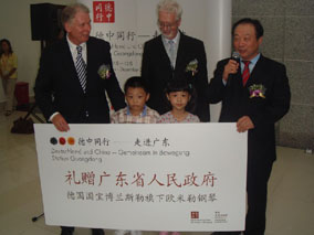 金秋11月,隨著"德中同行--走進廣東"活動的深入開展,作 為"德中同行"活動的重要組成部分,為期九天的"德國大道"活動在 廣州市天河體育中心西門廣場拉開了帷幕,并將持續(xù)至11月15日 。德國駐華大使、德國聯(lián)邦經(jīng)濟部國務秘書伯恩特·普法芬巴赫博 士、廣東省副省長宋海、德國外交部對華工作小組主任"德中同 行"特使芮悟峰博士、德國駐廣州總領事舒涵德先生、德國博蘭斯 勒鋼琴(中國)公司總經(jīng)理方陽等德國著名企業(yè)代表就出席了開幕式 。在開幕式上,德國國寶博蘭斯勒鋼琴旗下的德國歐米勒阿麗莎鋼 琴被德國政府選為國禮,歐米勒鋼琴被作為德中同行的象征,由德 國政府贈送給廣東省政府。德國駐華大使施明賢博士代表德國政府 向廣東省政府宋海副省長贈送了這一珍貴禮物。在贈送儀式上特別 邀請了一對6歲的雙胞胎姐弟為現(xiàn)場嘉賓演奏鋼琴四手聯(lián)彈-友誼地 久天長,此時全場歡聲雷動。