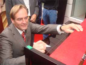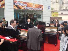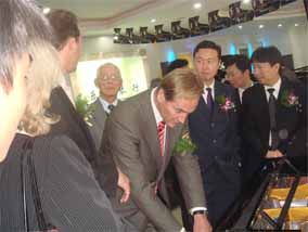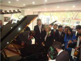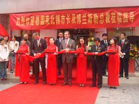 2007年10月25日,在南京樂(lè)博琴行德國(guó)博蘭斯勒鋼琴展廳 門口懸掛著中德兩國(guó)的國(guó)旗,門前張燈結(jié)彩。早上十點(diǎn)鐘,德國(guó)博 蘭斯勒鋼琴的出產(chǎn)地-萊比錫市長(zhǎng)榮格先生(MR.BURGHARD JUNG)以及德國(guó)萊比錫政府代表團(tuán)及德國(guó)媒體的代表出席德中同 行-德國(guó)博蘭斯勒鋼琴展(10月25日-11月8日)的剪彩儀式,德 國(guó)萊比錫市長(zhǎng)榮格先生,博蘭斯勒總裁博思進(jìn)先生,南京樂(lè)博有限 公司總經(jīng)理姚廣生先生為為期兩個(gè)星期的德國(guó)博蘭斯勒鋼琴展剪彩 。剪彩儀式結(jié)束后,在博蘭斯勒總裁博思進(jìn)博士及博蘭斯勒鋼琴中 國(guó)公司總經(jīng)理方陽(yáng)先生的陪同下,德國(guó)萊比錫市長(zhǎng),萊比錫前任市 長(zhǎng)及來(lái)賓們參觀了博蘭斯勒鋼琴展。博蘭斯勒旗下的歐米勒形象代 言人歐米勒孖寶為遠(yuǎn)道而來(lái)的貴賓再次表演絕技。在大家的邀請(qǐng)下 ,博蘭斯勒總裁博思進(jìn)博士也為在場(chǎng)的貴賓獻(xiàn)上一首世界名曲。博 蘭斯勒黃金般的音色令德國(guó)萊比錫市長(zhǎng)榮格先生以及前市長(zhǎng)躍躍欲 試。參觀完鋼琴展,正當(dāng)萊比錫市長(zhǎng)榮格先生要離開(kāi)時(shí),前來(lái)購(gòu)琴 的觀眾紛紛邀請(qǐng)市長(zhǎng)在其購(gòu)買的歐米勒鋼琴上簽名以作留念。博蘭 斯勒鋼琴展開(kāi)展后,博蘭斯勒總裁博思進(jìn)博士以及博蘭斯勒旗下的 歐米勒形象代言人歐米勒孖寶親臨現(xiàn)場(chǎng)簽售鋼琴。就在開(kāi)展的第一 天,江蘇樂(lè)博漢中店銷售的鋼琴近20臺(tái)博蘭斯勒旗下歐米勒鋼琴。