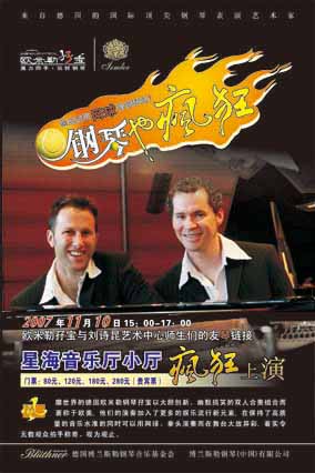 德國(guó)著名鋼琴藝術(shù)家、當(dāng)今世界鋼琴界的當(dāng)紅明星——?dú)W米勒 孖寶即將“駕臨”廣州。11月10日,歐米勒孖寶“鋼琴也瘋狂 ”——?dú)W米勒孖寶與劉詩(shī)昆藝術(shù)中心師生們友“琴”鏈接音樂(lè)會(huì)將 在星海音樂(lè)廳舉行。作為世界鋼琴界當(dāng)前最炙手可熱的人物,歐米 勒孖寶擅長(zhǎng)以非傳統(tǒng)的方式進(jìn)行鋼琴演奏,網(wǎng)球、拳頭、肘甚至臀 部都是他們演奏的工具,他們的魅力早已席卷歐美。這次廣州巡演 ,主辦方特邀劉詩(shī)昆藝術(shù)中心的師生們與歐米勒孖寶進(jìn)行一場(chǎng)音樂(lè) 聯(lián)歡,屆時(shí),不僅有鋼琴表演,還有舞蹈、小提琴、模特秀等精彩 演出。毫無(wú)疑問(wèn),這將是一場(chǎng)令人期待的音樂(lè)狂歡秀。