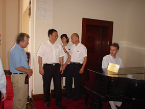 8月18日 ,博蘭斯勒 (Blüthner) 中國(guó)總經(jīng)理方揚(yáng)與 德國(guó) 音樂(lè)理事會(huì)主席奎格爾、德國(guó)駐華使館文化參贊馮 · 馬丁 一行數(shù) 人參觀了青島迎賓館。青島迎賓館坐落于風(fēng)景如畫的信號(hào)山南麓, 是青島“萬(wàn)國(guó)建筑博覽會(huì)”的“鎮(zhèn)寶”之作,系由德國(guó)建筑師拉查 魯維茨設(shè)計(jì)。德國(guó)威廉時(shí)代的典型建筑式樣、建筑材料與青年風(fēng)格 派手法和好地融合在這座經(jīng)典建筑中,即使在今天的德國(guó)本土也難 得一見(jiàn)。