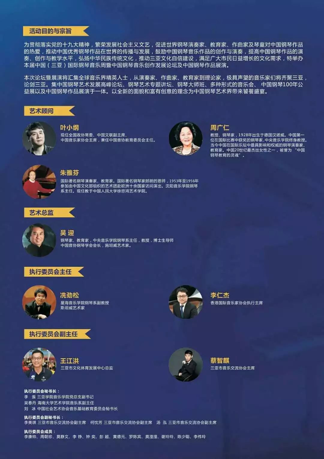 2018首屆中國(三亞)國際鋼琴音樂周,由現(xiàn)任全國政協(xié)常委、中國文聯(lián)副主席、中國音樂家協(xié)會主席,兼任中國音協(xié)教育委員會主任葉小綱;被譽(yù)為“中國鋼琴教育的靈魂”周廣仁與國際著名鋼琴演奏家、教育家朱雅芬擔(dān)任藝術(shù)顧問。中央音樂學(xué)院鋼琴系主任、中國音協(xié)鋼琴學(xué)會會長,著名鋼琴家吳迎擔(dān)任藝術(shù)總監(jiān)。本屆音樂周總共匯集了得到了中國音協(xié)鋼琴學(xué)會、中國11大音樂學(xué)院等25個專業(yè)團(tuán)體支持,音樂周規(guī)??涨?,活動形式豐富多彩,集高峰論壇、專題講座、大師公開課、多種形式的音樂會以及中國鋼琴作品展演于一體,內(nèi)容豐富是目前全國兼具欣賞價值和學(xué)術(shù)高度的音樂活動之一。德國博蘭斯勒鋼琴中國區(qū)總裁方陽,德國博蘭斯勒鋼琴??趯I店總經(jīng)理黃德元,羅賓應(yīng)邀出席活動。