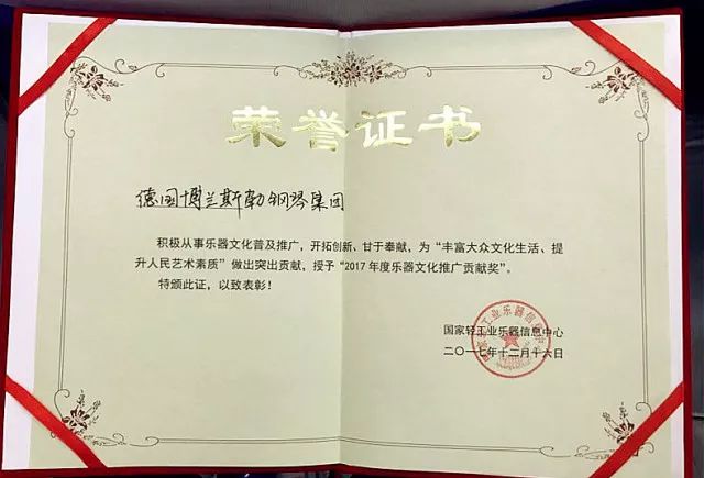 16日,“和樂器 贏未來”國家級核心刊物——《樂器》雜志創(chuàng)刊45周年交流會議在北京舉行。德國博蘭斯勒鋼琴集團榮獲“2017年度樂器文化推廣貢獻獎”。德國博蘭斯勒集團德國隆尼施鋼琴銷售總經(jīng)理徐小劍代表出席了大會。